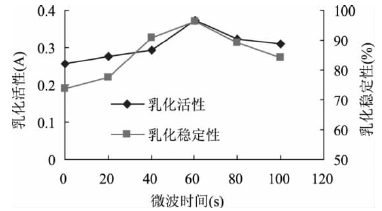 [9]等人對鷹嘴豆分離蛋白應用不同處理方式,并研究了這些處理方式對蛋白乳化性質的影響。課題中取100ml濃度為0.5%(w/v)的蛋白質溶液,用 0.5mol/L的NaOH調節pH為7.0,然后置于微波爐中處理,微波爐功率為800w,處理時間分別為0、20、40、6080、100s,處理完后加入20mL大豆色拉油,高速攪拌后根據2.2.1中所述方法測定EA和ES。