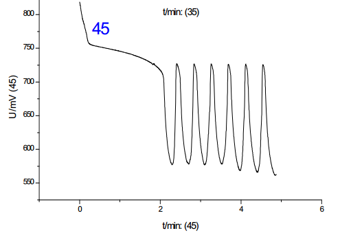 從圖中可以看出:在這四種情況下,體系均可以產(chǎn)生化學(xué)振蕩,但是誘導(dǎo)時(shí)間和振蕩周期略有差別。其中,第二組的體系振蕩周期**短,第四組的誘導(dǎo)周期**短。從理想的反應(yīng)體系分析,振蕩的發(fā)生和振蕩周期應(yīng)該與反應(yīng)物質(zhì)的加入順序基本無(wú)關(guān),因而基本相同,加入順序主要會(huì)影響到反應(yīng)的誘導(dǎo)時(shí)間,但從實(shí)驗(yàn)結(jié)果看,雖然四組反應(yīng)振蕩周期和誘導(dǎo)時(shí)間基本一致,但是又略有差別,忽略反應(yīng)偶然因素分析認(rèn)為: