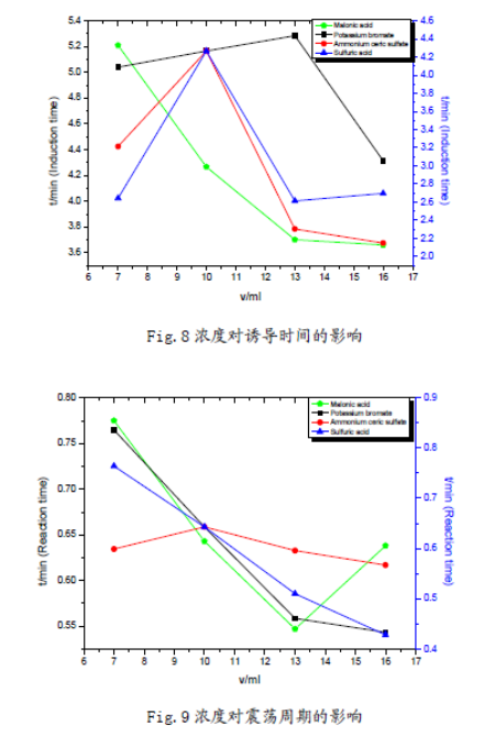 在40°C恒溫條件以及相同的加入順序下,分別改變丙二酸、溴酸鉀、濃硫酸、硫酸鈰銨的濃度(體積用量按7mL,10mL,13mL,16mL變化),考察誘導(dǎo)時(shí)間和振蕩周期的變化。