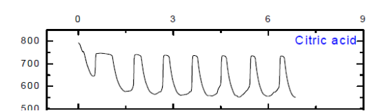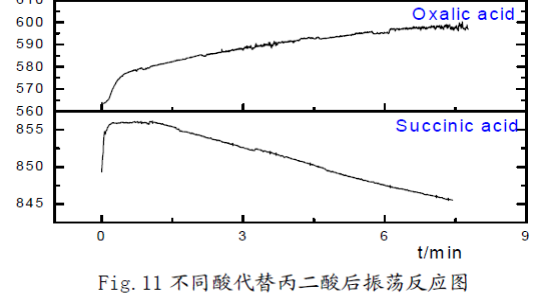 (1) 用0.45M丁二酸、0.45M乙二酸、0.45M檸檬酸代替丙二酸后,僅有蘋果酸、檸檬酸可以觀察到振蕩現(xiàn)象,乳酸沒(méi)有振蕩現(xiàn)象但是出現(xiàn)異常現(xiàn)象。