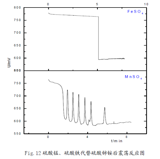 3) 用硫酸錳代替硫酸鈰銨后,可以看到振蕩現(xiàn)象,但是用硫酸鐵代替硫酸鈰銨,振蕩反應(yīng)沒(méi)有發(fā)生,但是查閱資料知:Mn2+、Fe3+同樣具有催化作用。在振蕩體系中,錳元素存在Mn2+、Mn3+兩種形式,鐵元素以Fe2+、Fe3+的形式存在。