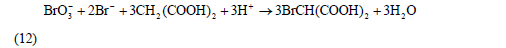 此時(shí),濃度較大的Br2與丙二酸反應(yīng)生成BrCH(COOH)2,即反應(yīng)(8)。反應(yīng)(8)與反應(yīng)(11)構(gòu)成了Br-與Br2的循環(huán),其總體的宏觀效果(簡(jiǎn)稱過(guò)程A)可表示為: